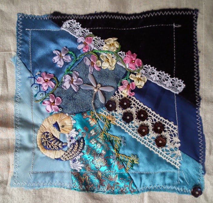 I actually found this block quite difficult to do. For me, crazy quilting is all about the seams and seam treatments, with motifs and other embellishments an added extra to fill in blank spaces. So having to treat a block as a single whole canvas for a picture was very hard. Seam work breaks a block up into pieces, which isn't really desirable if you are treating the block as a single unit to 'paint a picture' on. And when doing a scene, things really need to have a reasonable degree of proportion. It doesn't have to be an OCD level of exactness in proportion, but you can't really have a dragonfly bigger than your flower cart - not unless you are doing a scene of a flower seller who has been zapped back 300 million years to the Carboniferous period. I don't think that was what Barbara had in mind!